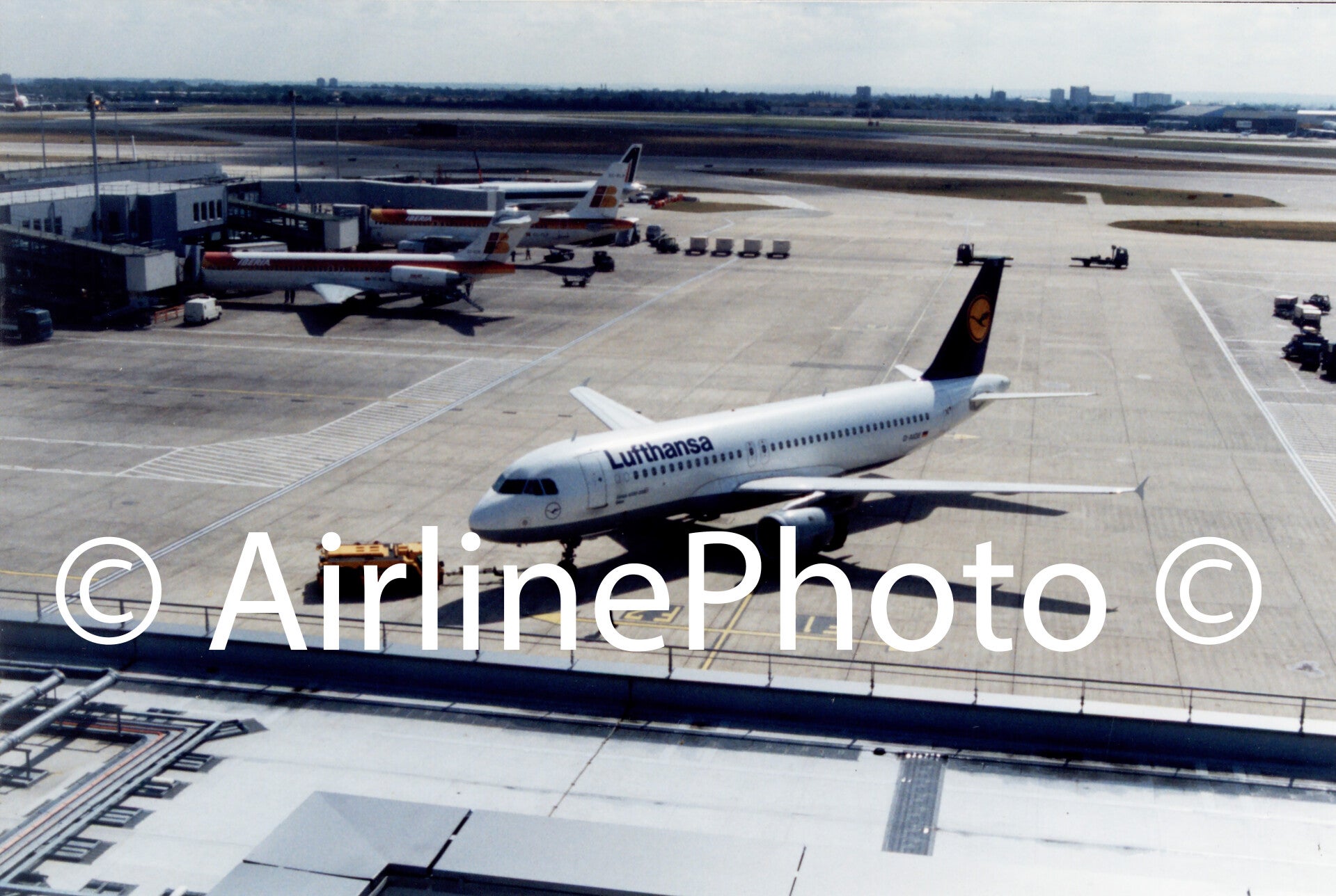 Lufthansa Airbus on pushback at London Heathrow UK 03-05-1995